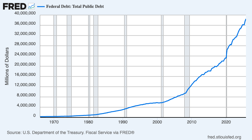 The simplest way to see this is to look at the federal debt, which has exploded from roughly $400 billion in 1971, when Nixon closed the gold window, to over $38 trillion today.